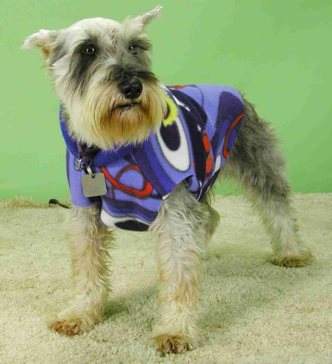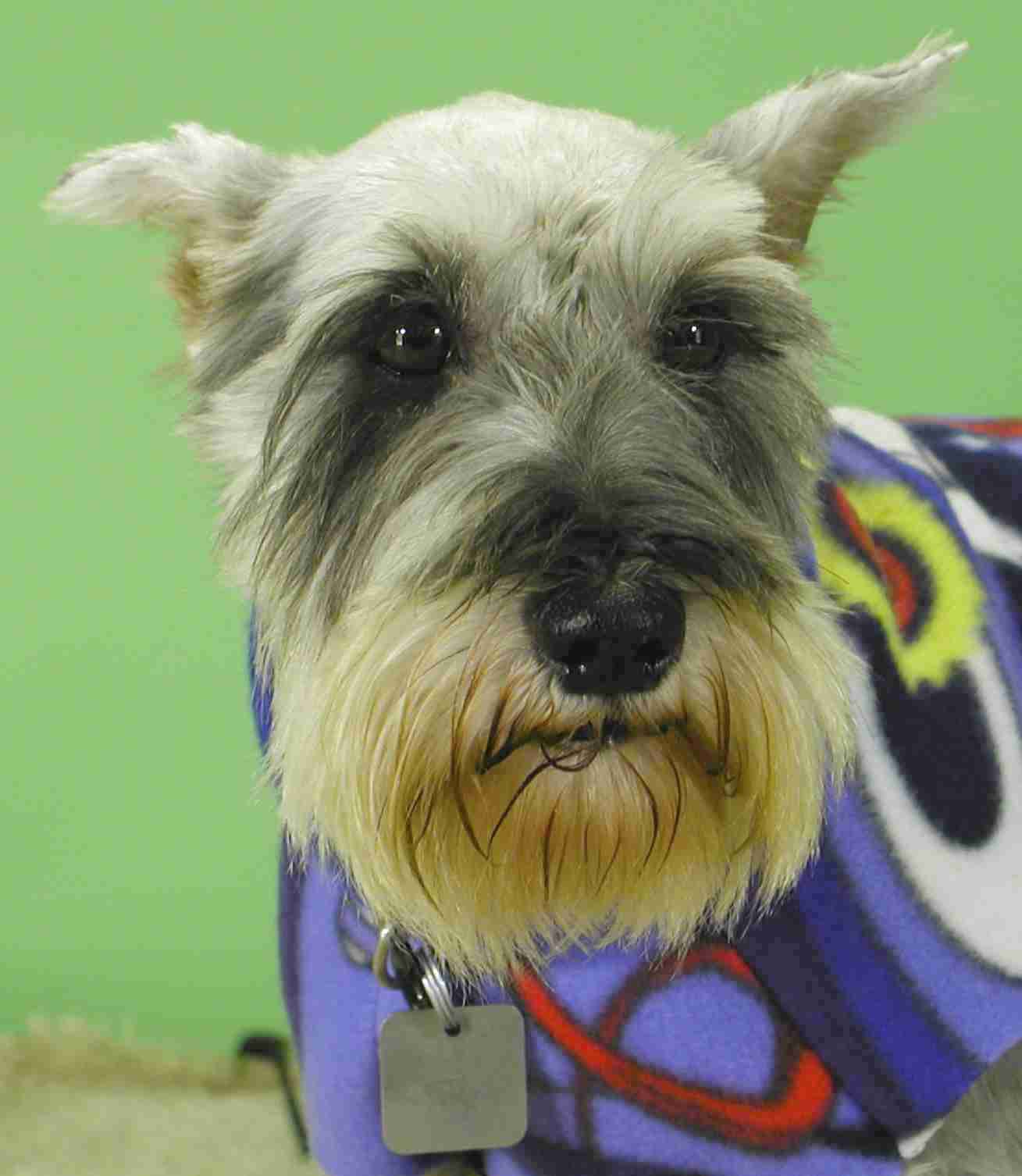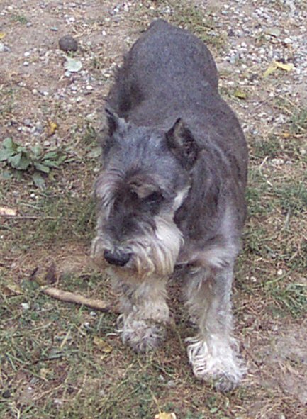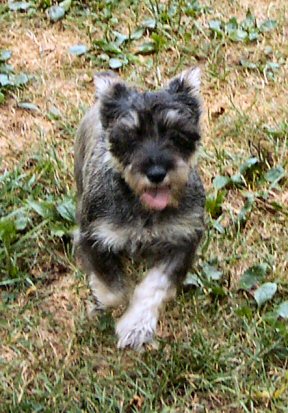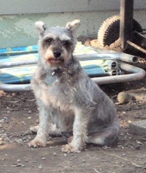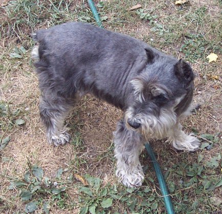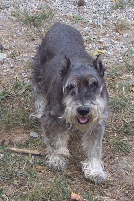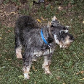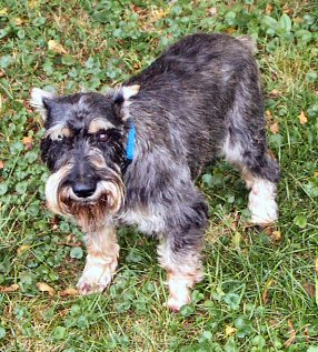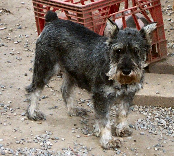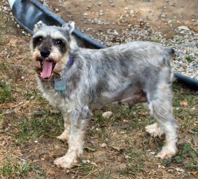 Chet is an 8-9 year old miniature schnauzer, albeit a larger one. He came from a shelter as a stray, and weighs in at about 30lbs. Chet is a very sweet boy - when he came to us, he was a huge hairball. On giving him a haircut, we found a ton of old and new sores under his coat. His back is now almost completely healed, his coat is coming in, and he's like a different dog. Chet is housebroken, crate trained, and gets along well with other dogs. He's begun to display quite the personality since he's feeling better, and will make someone a truly wonderful companion.