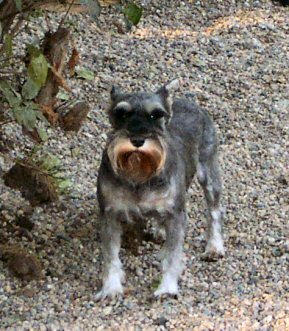 Dotti is a 7 year old miniature schnauzer who was rescued from a puppy mill. She's a former "puppy mill mama", who wasn't wanted anymore. She's SWEET....very shy, but wants attention so she'll creep over quietly to get her chin scratched. Dotti was doing very well on housebreaking, but has backslid lately - she was recently spayed, and had a large hernia repaired at the same time. This sweet girl has become a LOT more pushy about seeking out attention - what a doll! Her mask is lovely, and once her beard grows out she's going to be a gorgeous girl! Dotti's housebreaking continues to improve - she's doing well, if kept on a schedule!