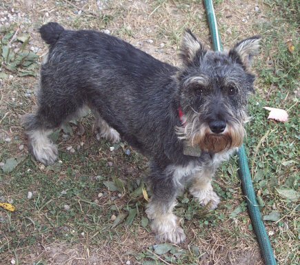 Hans is a 6-7 year old miniature schnauzer, rescued from a puppy mill. He's a very nice boy, seems to be quite mellow, and coming along well with housebreaking. He likes affection, and isn't shy about asking for it, but he isn't pushy either. Hans does mark, and will be neutered (and have his awful teeth cleaned) on August 11th. Other than marking, Hans appears to be mostly housebroken. Update - Hans was neutered, and lost a bunch of teeth in his dental cleaning - but he BOUNCED out of the vet clinic! Those teeth must really have been bothering him! He's recovering now, and will be looking for a new home! Hans has begun to play a bit more with the other dogs, and has REALLY started to look for affection. We've discovered he's terribly camera shy, though - getting pics was a real challenge!